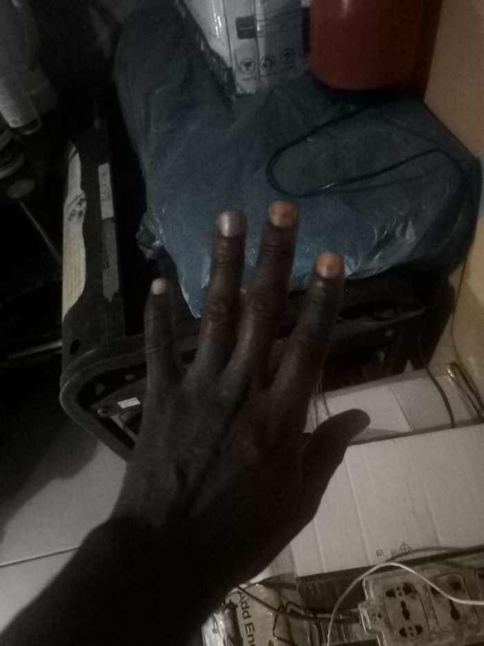 - "In Unguwar Gabas, Nigeria, a dim, indoor scene is depicted, dominated by a dark-skinned left hand extending from the lower left towards the upper center" by FM-NMP1m1, licensed under CC BY 4.0