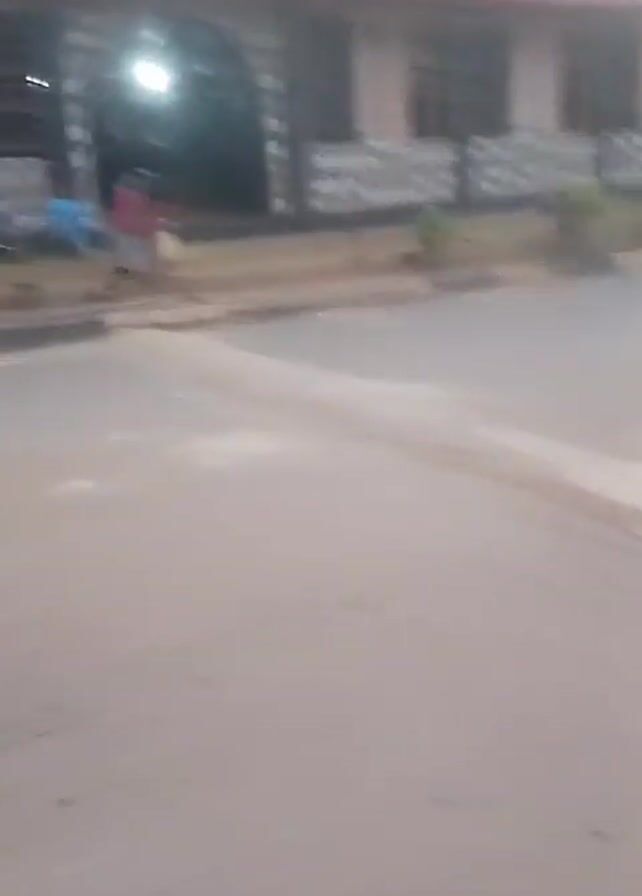 street with a light grey asphalt surface and adjacent buildings. The video starts with a view of a large building with a facade of stone or cement. Several people are standing near the entrance. The camera then pans to the right, showing the street. A person is walking away from the camera on the right side of the road. As the camera continues to move, a metal fence is seen on the left side of the road, followed by a parked car. Finally, the camera pans back to the street, showing a person riding a bicycle in the distance. The road is lined with houses. The sky is overcast.