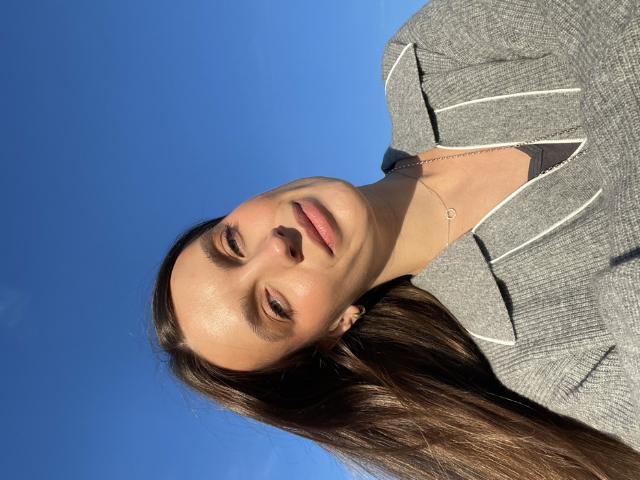 A young adult female is depicted in a close-up, likely selfie-style, outdoor portrait under a clear blue sky in Mojanovići, Montenegro. She has long, dark brown hair, parted on the left, which extends over her left shoulder. Her face is illuminated by direct sunlight, highlighting her features, including light-colored eyes, defined eyebrows, and a slight smile. She wears a grey knit polo-style top with a V-neck and collar, accented by white piping along the edges of the collar and V-neck opening. A dark undershirt is visible beneath the grey top. Accessories include a small gold-colored hoop earring in her left ear, a short silver-colored necklace with a small circular pendant, and a longer, finer silver-colored chain. No other individuals, objects, or structures are visible in the background beyond the unblemished sky.