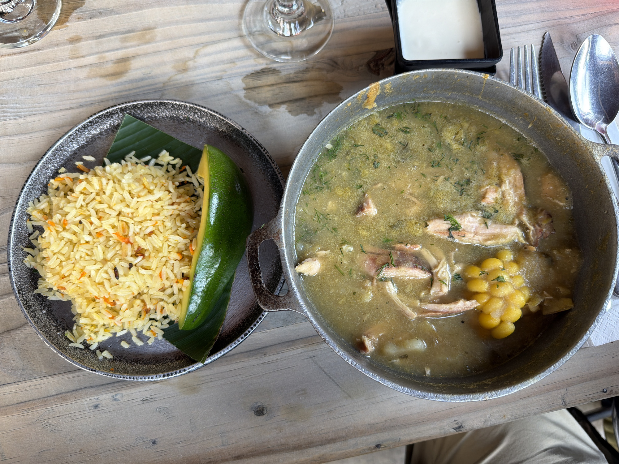 An overhead view captures a meal served on a light-colored wooden plank table, consistent with a dining establishment in Bogota, Colombia. The upper half of the image features a dark, textured ceramic plate containing a mound of light yellow rice, intermixed with small orange vegetable pieces and dark specks. A halved green avocado, resting on a green banana leaf, is positioned alongside the rice on the same plate. Below this, a metallic, two-handled pot holds a light greenish-brown stew or soup. Visible ingredients within the stew include irregular pieces of cooked chicken, chunks of white potato or similar tuber, and a segment of yellow corn on the cob. To the right of the pot, metal cutlery—a fork, a serrated knife, and a spoon—are arranged. Adjacent to the cutlery, a small black square container holds a white, opaque liquid or paste. A clear, stemmed glass is partially visible in the upper right quadrant of the scene. No individuals are depicted.