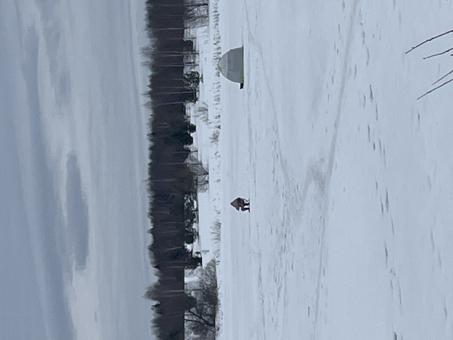 The image depicts a vast, snow-covered landscape, identified as being in the city of Kalinino, Russia, under an overcast sky. The foreground and mid-ground consist of a flat, expansive frozen surface, likely a lake or river, covered in a uniform layer of snow. Visible faint tracks or depressions traverse the snow, leading towards the center of the frame. In the mid-ground, one individual is seated on a dark, portable folding chair. The person is dressed in thick, dark winter clothing, including a jacket and possibly a hat, and is oriented with their back largely to the viewer, facing towards the frozen surface. Approximately ten meters to the right of the seated individual, a light-colored, dome-shaped ice fishing tent is pitched directly on the snow. It appears to be grey or light green and has a low profile. The background features a dense, horizontal treeline composed primarily of leafless deciduous trees with thin, dark trunks and some darker evergreen conifers, suggesting a distant forest or wooded area. The sky above is entirely overcast, displaying various shades of light grey, with no direct sunlight visible. The overall lighting is diffuse and subdued.