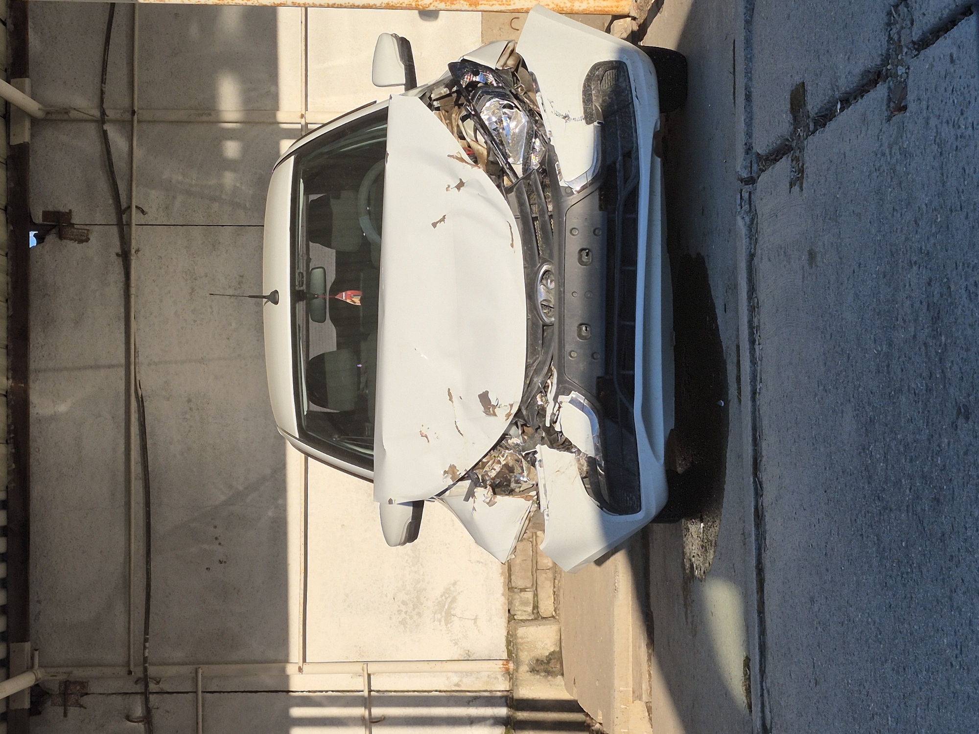 A white Lada vehicle, exhibiting severe frontal impact damage, is parked stationary under a covered structure in Chaikovsky, Russia