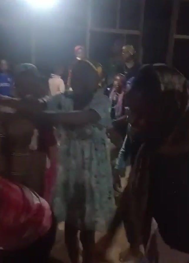 group of people, mainly women and children, dancing outdoors at night, with visible dust on the ground