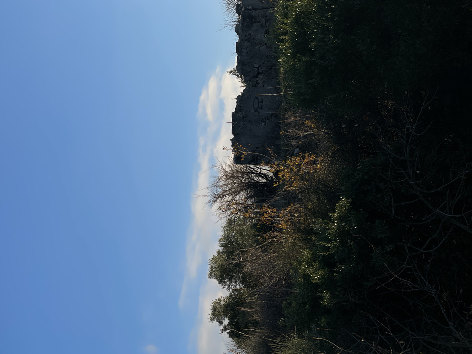 The image depicts an outdoor scene in Dubravcevina, Montenegro, under a clear blue sky with sparse white clouds. The lower portion of the frame is dominated by dense, varied vegetation, including dark green leafy shrubs in the foreground and a mix of green, yellowing, and bare deciduous branches in the midground. To the mid-right, partially obscured by this foliage, are the grey, crumbling ruins of a stone wall. An etched or carved symbol resembling a fish is visible on the surface of this wall. No individuals or discernible actions are present.