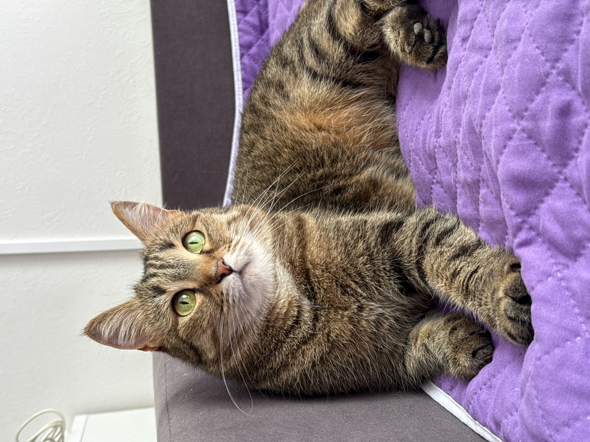 A tabby cat with green eyes is lying on a gray surface. The cat is partially covered by a quilted purple blanket. The cat's paws are visible on the blanket. The background includes a white wall and a dark gray surface. The location in the city of Chaikovsky, Russia is not identifiable from the image.