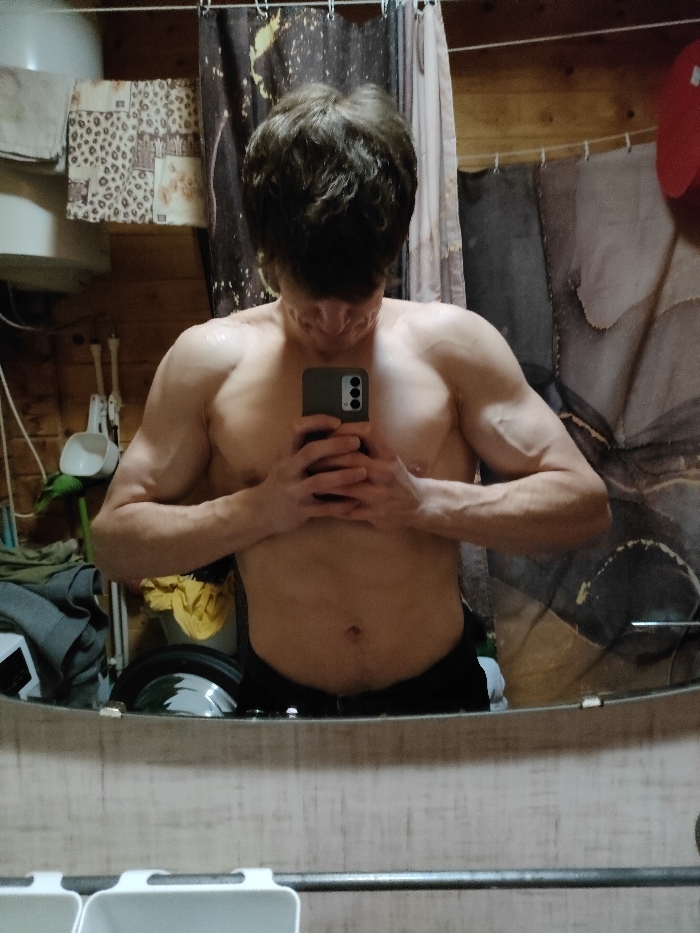 A muscular man, with dark hair obscuring his face, is taking a selfie in a bathroom mirror. He has a defined chest and arms, showcasing vascularity. The bathroom setting is cluttered, with a water heater, towels, and a patterned shower curtain visible in the background. The mirror's reflection includes items on the counter below. The man is shirtless, wearing black shorts.