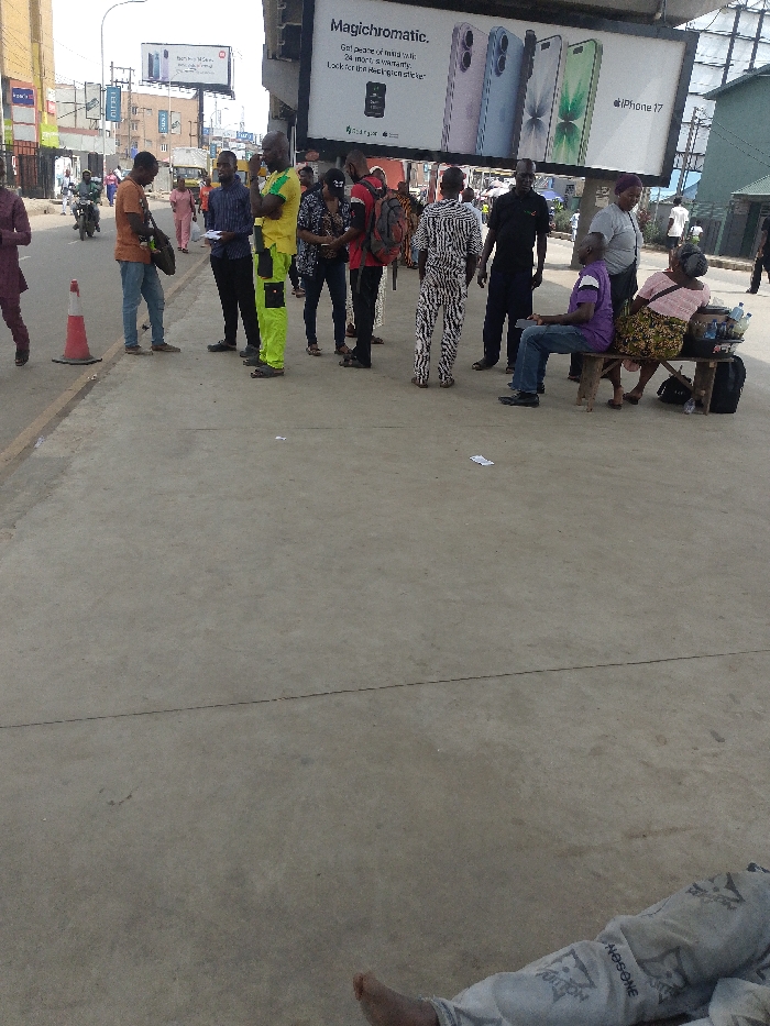 This image captures a busy urban street scene in Ikeja, Nigeria, under bright daylight. The foreground is dominated by a concrete pedestrian pathway. In the immediate foreground, the lower legs and bare right foot of an individual, wearing light grey trousers with text including "NEOSONE," are visible, suggesting they are lying or resting low on the ground. Mid-ground, a diverse group of approximately fifteen individuals is present. On the left, a person in a maroon traditional garment walks away from the camera, past a red and white traffic cone. To their right, two men stand; one in an orange t-shirt and blue jeans holds a black bag, while another in a striped shirt holds a white document. A man in distinct yellow and neon green workwear stands with his arms crossed. Further right, a cluster of people includes a woman with a dark patterned top and backpack, a man in a red t-shirt and red backpack, and a man in a black and white zebra-patterned outfit. On the far right, a makeshift vendor setup features a woman in a pink top and patterned skirt seated on a low wooden bench, with small items arranged for sale on the bench and a black bag on the ground. Beside her, a man in a purple t-shirt and blue jeans sits on the same bench, observing something in his hands. Standing near this group is a man in a black t-shirt and black trousers. Overhead, a large billboard prominently displays "Magicchromatic" and advertises "iPhone 17" with images of four phone color variants (pink, blue, green). The billboard text includes "Get peace of mind with 24 months warranty. Look for the Magicchromatic sticker." In the background, a street runs parallel to the pathway, with a motorcycle and a yellow tricycle visible. Commercial buildings and utility poles with overhead wires line the street. Small pieces of white paper are scattered on the concrete ground.
