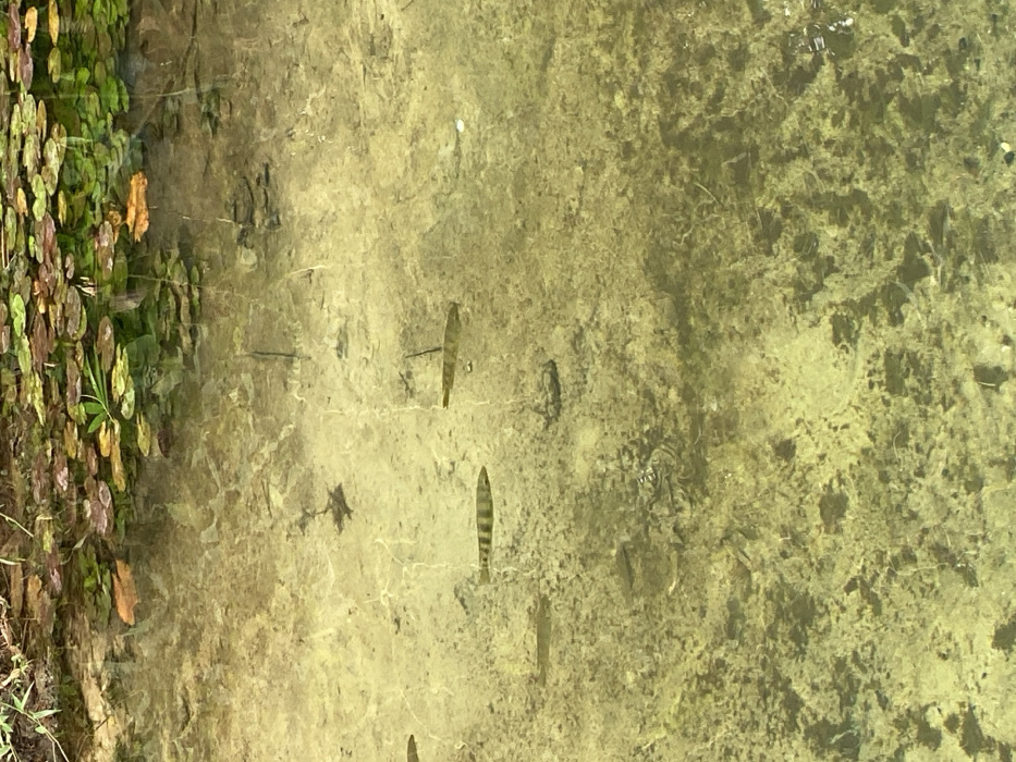The scene depicts a clear, shallow body of water in Ikot Obio Ata, Nigeria, viewed from an overhead perspective. The upper perimeter of the water features numerous floating aquatic plants with green and reddish-brown leaves, reflecting on the surface. Within the transparent water, several fish are observed. One fish in the mid-left exhibits pronounced dark horizontal stripes. Another lighter-bodied fish is situated diagonally upwards and to the right. The water's bottom is discernible, composed of light-colored sediment or sand with scattered darker organic debris and algae, animated by dappled sunlight patterns.