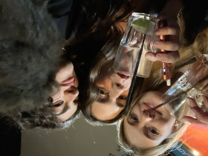 The image depicts three young adult females in a close-up, low-light setting, likely indoors in Paris, France. The blurred background features warm, indistinct lighting and a faint sign containing letters suggestive of "THÉÂTRE," indicating a venue or area near a theater. From left to right: 1. A female with blonde hair is smiling towards the camera, holding a clear glass with a black straw to her mouth. She is also holding a rose gold/copper electronic vaping device in her right hand. 2. A female with dark brown hair is looking towards the camera, holding a clear glass containing a lime wedge and a black straw. Her lips are slightly parted. 3. A female with dark, curly hair, partially visible on the right, is looking slightly off-camera. She is wearing a dark, possibly faux fur, garment. The individuals are positioned closely together, suggesting a self-portrait or group photograph in a social environment. Two individuals are holding beverages, and one is holding a vaping device.