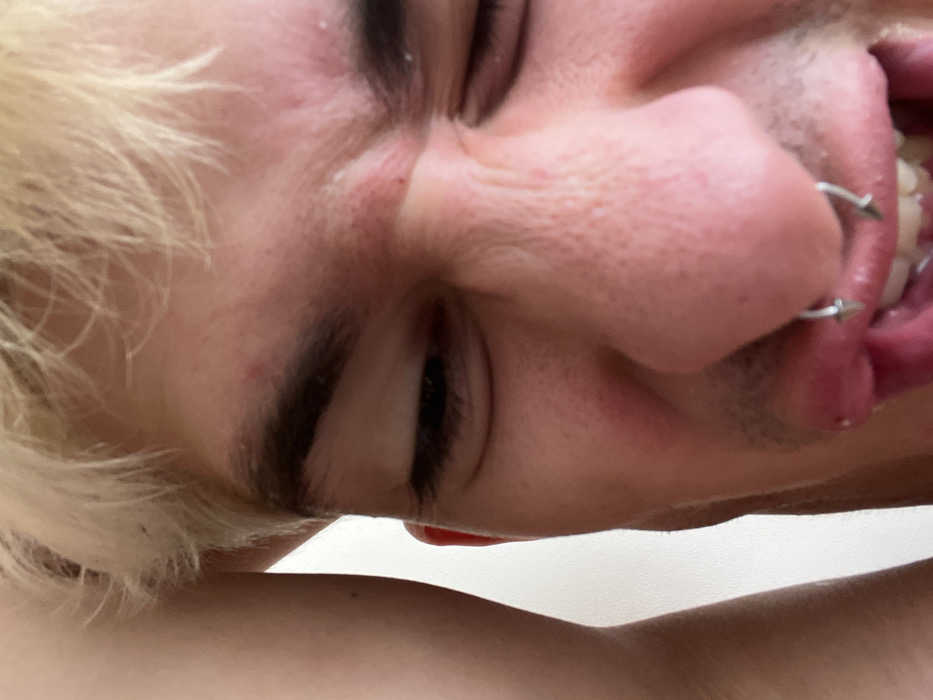 The image displays a tight, close-up, high-angle portrait of an individual's face, primarily focusing on the upper half. The subject has bleached blonde hair visible at the top of the frame. Dark eyebrows arch above tightly closed or squinted eyes, surrounded by creased skin consistent with a strong facial expression. The skin on the forehead and around the bridge of the nose shows redness and minor blemishes. The nose is prominent, with visible pores. The mouth is open, revealing teeth, and features a silver horseshoe-shaped septum piercing with pointed ends. A slight stubble is visible on the upper lip and chin area. The overall facial configuration suggests an intense expression, possibly of strain, discomfort, or an exaggerated reaction. A bare arm or shoulder is partially visible on the left side of the frame, against a plain, light-colored background that appears to be a wall. The setting is indoors. The location in the city of Sofia, Bulgaria, cannot be determined from the visual information provided in the image.