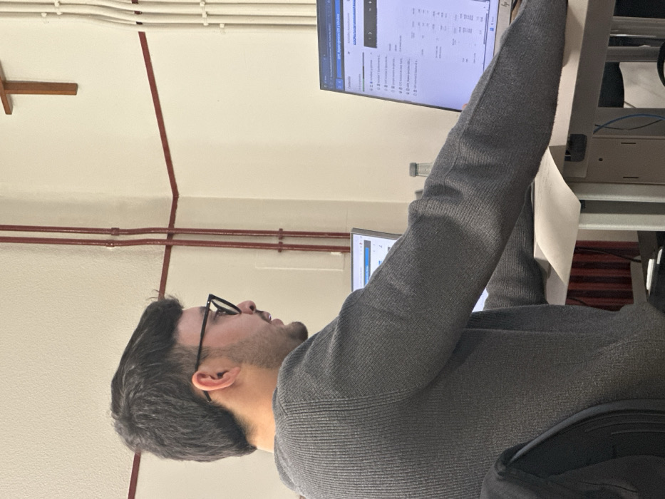 - "A young adult male, seen from the upper torso in right profile, is seated at a white desk in an indoor environment" by FM-1e4ny2, licensed under CC BY 4.0