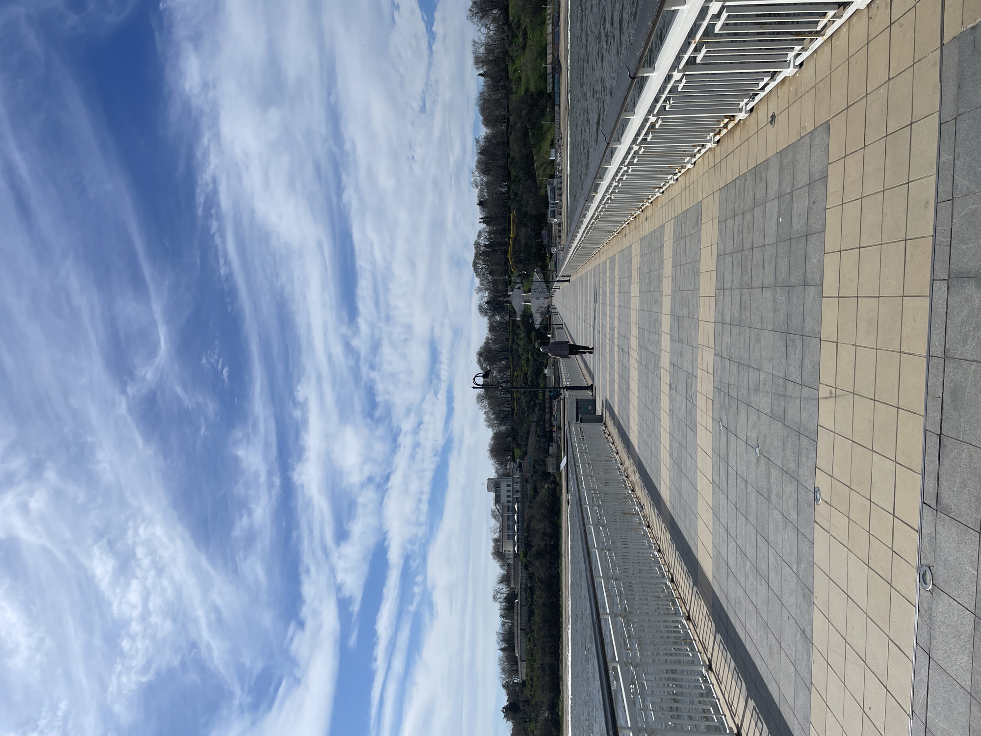 A person is walking along a waterfront promenade in an unknown city. The promenade is paved with light-colored and gray tiles. A white railing runs along the edge of the promenade, separating it from the water. Across the water, a tree-lined embankment is visible, with buildings peeking through the trees. The sky is blue with streaks of white clouds. A lamppost stands on the promenade near the person.