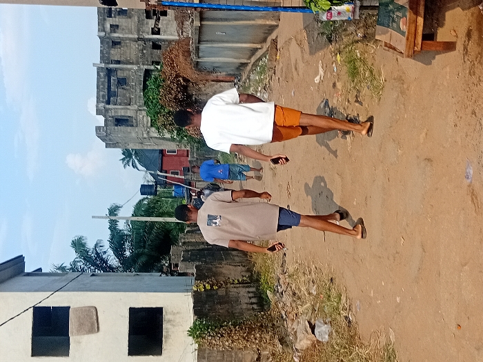 Three people stroll along a dirt path beside unfinished buildings. Two men in front, one in a white shirt and orange shorts, the other in a tan shirt and blue shorts, both wearing flip-flops and holding phones. A third person in a blue shirt follows behind. The buildings appear to be in various stages of construction with visible brickwork and uncompleted windows. The surroundings are somewhat cluttered with debris and vegetation. The sky is blue.