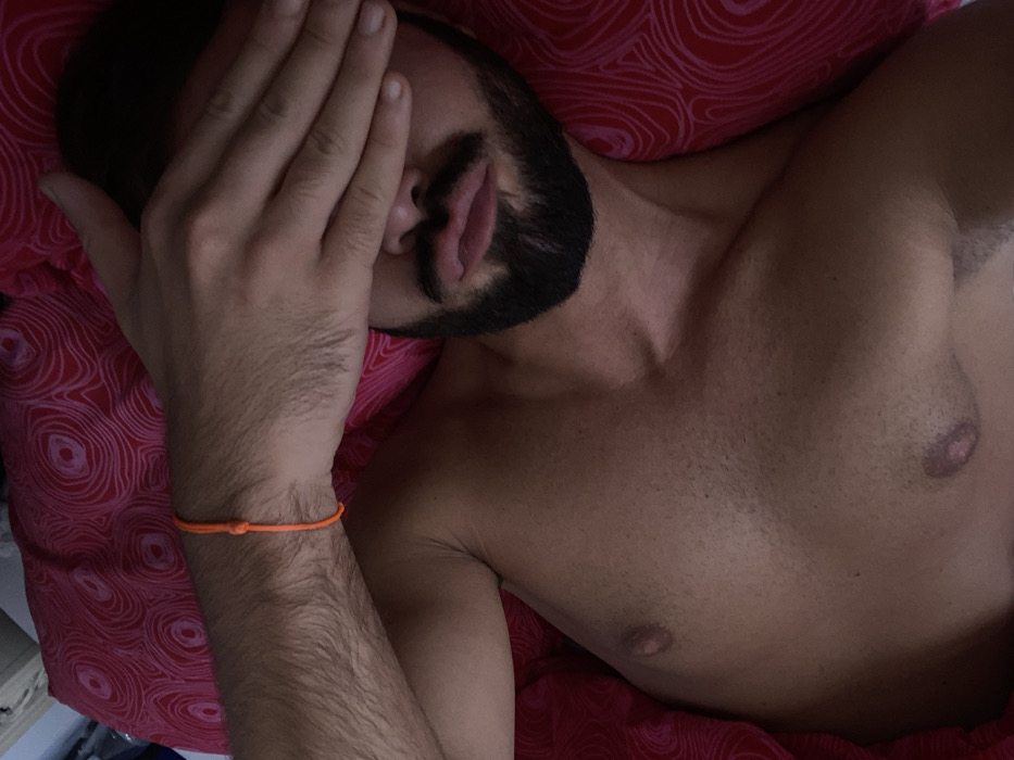 An adult male is depicted lying on a red bed with a swirling, abstract pattern, in what is identified as a location in Wattrelos, France. His head rests on a pillow matching the bed's pattern. The subject has dark hair and a full beard. His right hand is positioned over his eyes, obscuring them. His lips are slightly parted and pursed. The upper torso is bare, revealing medium skin tone. An orange string bracelet, tied with a single knot, is visible on his left wrist. The scene is dimly lit.