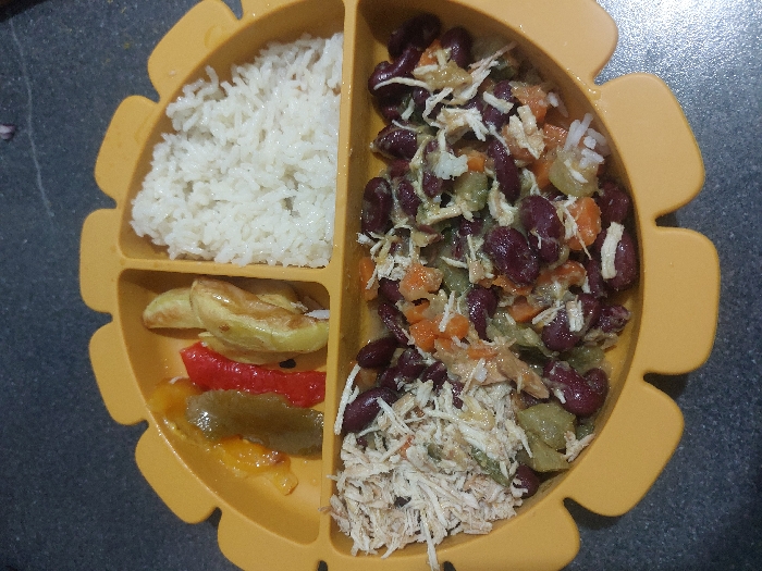 A divided, yellow plate holds three food items. White rice fills the upper left section. Cooked vegetables, including zucchini, red pepper, and yellow bell pepper, occupy the lower left section. The remaining section holds a mixture of kidney beans, shredded chicken, and small diced vegetables. The food appears to be prepared for a child.