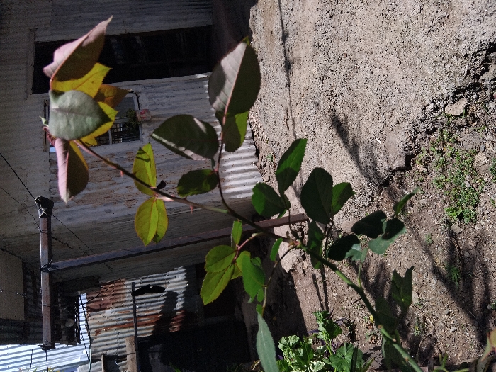 An outdoor scene in Ngong ward, Kenya, is depicted under bright daylight. The primary subject is a plant, likely a rose bush, positioned in the foreground and center, with a green stem featuring visible thorns and numerous green leaves, some exhibiting reddish-yellow coloration towards the upper portion. The plant casts distinct shadows on the dry, uneven ground, which consists of compacted earth and small stones, with sporadic patches of green weeds. In the background, two structures constructed from corrugated metal sheeting are visible. The dominant structure on the right features light grey, vertically oriented corrugated panels, a small rectangular window with bars, and a dark, open doorway. To the left, a rust-colored corrugated metal structure is partially visible. An overhead wooden beam or utility pole is stretched horizontally across the upper-left background, with black wires attached. No people or animals are present in the frame.