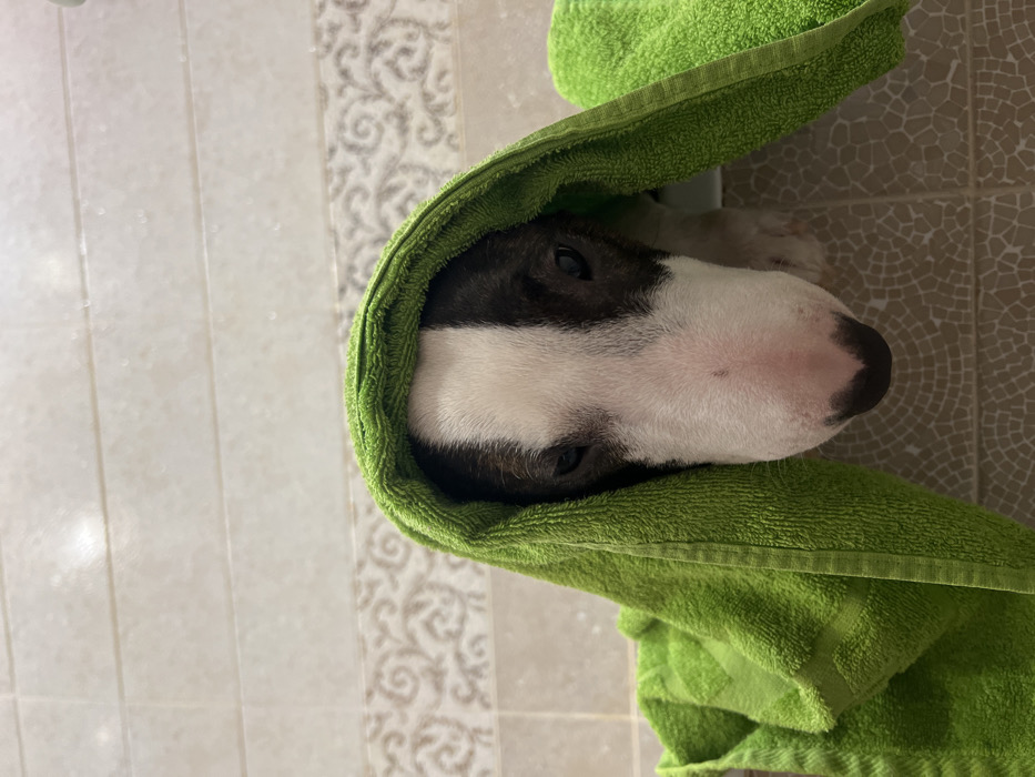 The image displays a Bull Terrier dog, predominantly white with distinct black markings surrounding both eyes and extending to one side of its head. The dog is directly facing the camera, with its head and upper body enveloped in a vibrant green terrycloth towel, creating a hooded effect. Its eyes appear partially closed, conveying a subdued or weary expression. The immediate background consists of light-colored, rectangular wall tiles, possibly cream or beige, featuring a decorative patterned frieze running horizontally. Below the dog's head, a tiled surface, likely the floor, is visible, composed of smaller, darker, possibly mosaic-style tiles. The scene takes place in an indoor environment, consistent with a bathroom, purportedly located in Izhevsk, Russia.