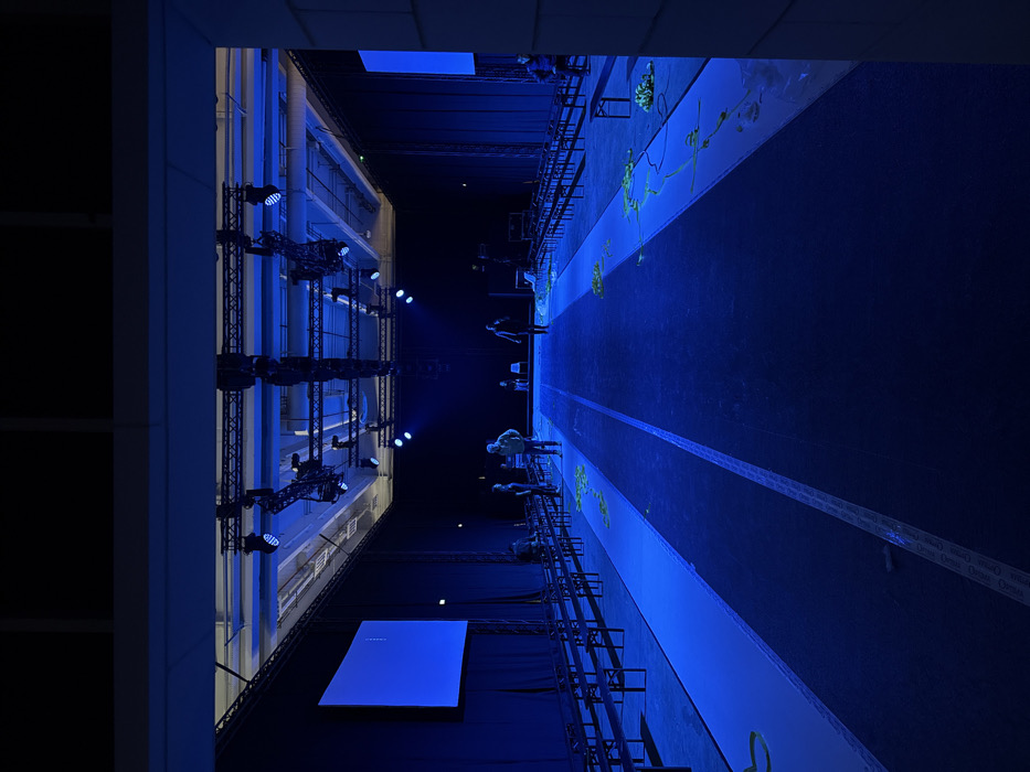 The image depicts an indoor event space in Issy-les-Moulineaux, France, observed from a framed opening on the right. A prominent, dark blue central pathway with a faint lighter stripe runs into the background, flanked by lighter blue strips. Dark, bench-style seating is arranged in multiple rows on both sides of this pathway, facing inward. Overhead, an extensive metal truss system supports numerous stage lights, casting a dominant blue illumination throughout the hall. Walls are uniformly covered in black drapes. Two large, rectangular screens are visible: one on the left displays a solid blue image with minimal white text, and a second, partially obscured screen is on the far right. Seven individuals are present within the space: three are on the left side of the central pathway, two are near the distant end of the pathway in the background, and two are positioned on the right side. Their actions include standing or walking. Scattered clusters of light-colored, possibly yellow or green, organic material resembling foliage are distributed on the lighter strips adjacent to the central pathway, glowing under the blue light. The underlying floor surface beneath the event setup appears light-colored.