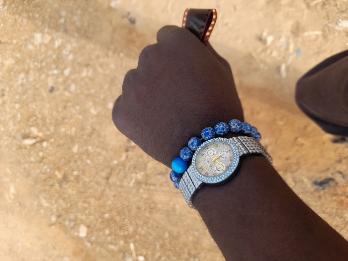 A dark-skinned arm is displayed, adorned with a silver watch and a blue beaded bracelet