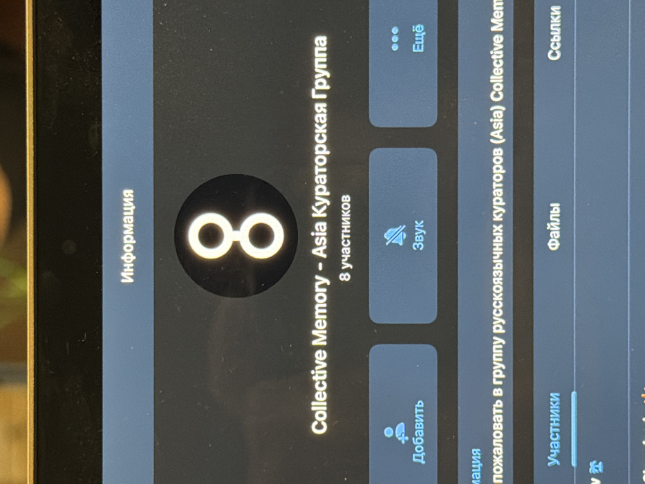 This image displays a close-up, eye-level view of a digital screen, likely a tablet or laptop, exhibiting a group interface within a communication application. The scene is located in Kerobokan Kelod, Indonesia. The screen presents a dark gray background with white text and light blue interactive elements. A blue header bar at the top contains the Cyrillic word "Информация" (Information). Centrally positioned below the header is a circular profile icon featuring a stylized white number "8" on a black background. Beneath this icon, the text "Collective Memory - Asia Кураторская Группа" (Collective Memory - Asia Curatorial Group) is visible, followed by "8 участников" (8 participants). Below the group details, three horizontal rectangular buttons are displayed: the leftmost button, labeled "Добавить" (Add), includes a silhouette icon of a person with a plus sign; the central button, labeled "Звук" (Sound), shows a muted bell icon; and the rightmost button, labeled "Ещё" (More), features a three-dot icon. Further down, a partial line of Cyrillic text reads "пожаловать в группу русскоязычных кураторов (Asia) Collective Mem..." (welcome to the group of Russian-speaking curators (Asia) Collective Mem...). At the bottom of the visible screen area, three navigation tabs are present: "Участники" (Participants) is highlighted in blue, followed by "Файлы" (Files) and "Ссылки" (Links). Subtle reflections are visible on the screen's surface, indicating an indoor setting with ambient light; a light brown or beige surface, possibly furniture or a wall, is faintly reflected at the top edge of the physical screen frame.
