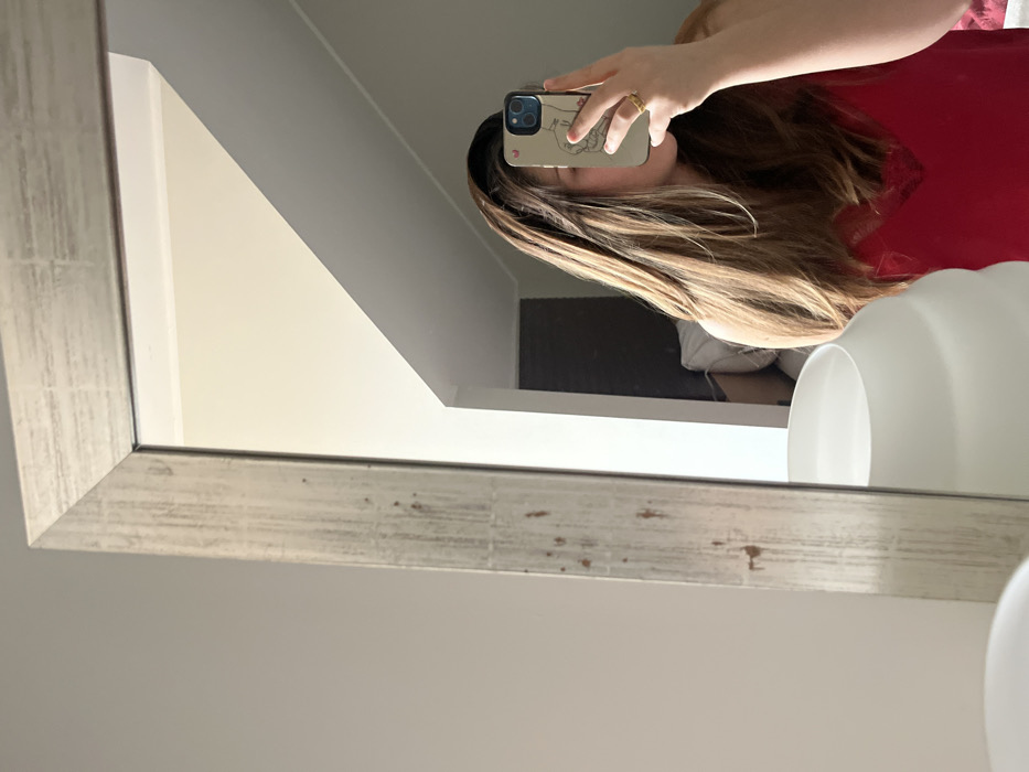 The scene depicts an indoor mirror selfie taken in a room located in Segrate, Italy. A vertical rectangular mirror with a distressed light-colored wooden frame occupies the central and left portions of the image. The frame exhibits a weathered appearance with visible grain and minor dark specks. Reflected in the mirror is an individual, likely a female, with long, light brown hair, positioned to capture their own image. The person is wearing a red top with a visible lace or v-neck detail. Their face is largely obscured by a light-colored smartphone, held with both hands, which features a distinct black line art graphic, possibly depicting a hand or abstract figure, and a prominent camera module. A gold-colored ring is visible on the ring finger of the person's right hand. The reflected background reveals an interior space with light-colored walls and a sloped ceiling line, suggesting an attic room or a space with a pitched roof. To the right of the reflection, a doorway or opening leads into a darker area where a light-colored object, possibly bedding, is visible. In the physical foreground, outside the mirror's reflection but within the image frame, a white, translucent object with a ribbed or wavy surface, resembling a lampshade or decorative vase, is partially visible in the lower left corner.