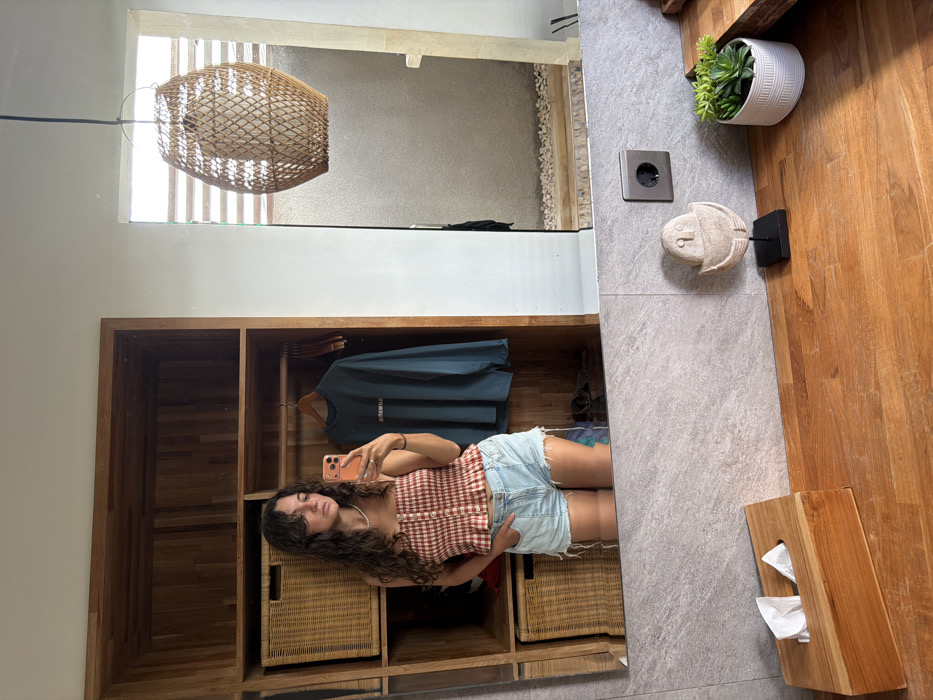 A reflection shows a woman with long curly hair taking a photo in a mirror. She is wearing a checkered top and denim shorts. Behind her, a wooden shelving unit contains baskets and a dark teal shirt on a hanger. The background reveals a wicker lampshade, a window, and what appears to be a bathroom area. The foreground features a gray tile surface with an electrical outlet, a stone sculpture, a potted plant, and a wooden tissue box. The entire image is rotated 90 degrees counter-clockwise.