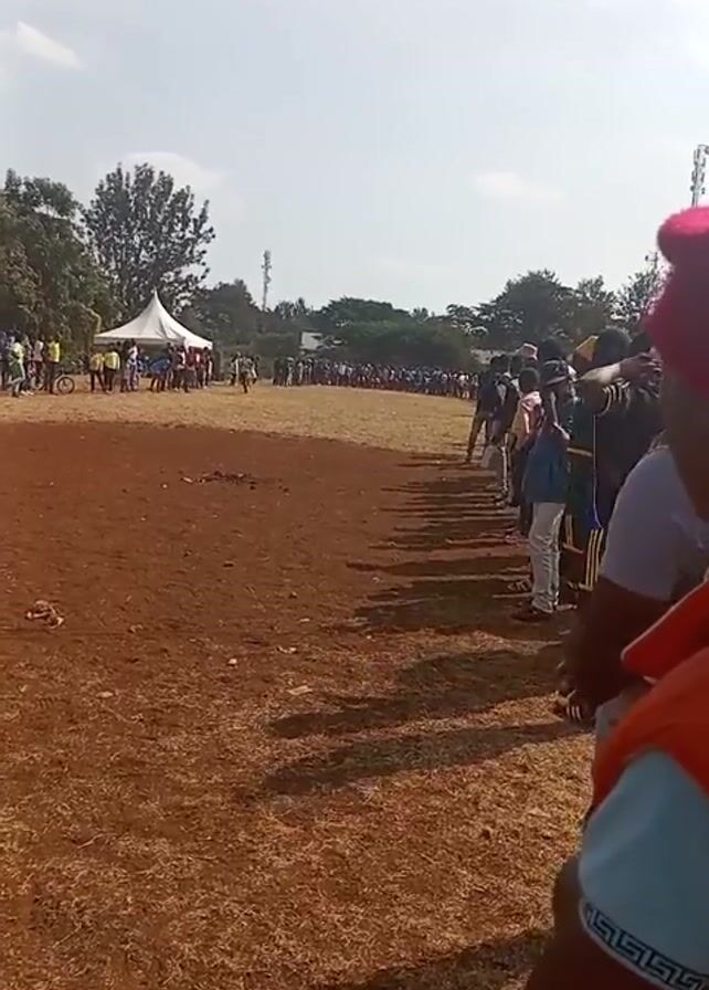A crowd of people stands along a dirt field watching a person run toward the finish line