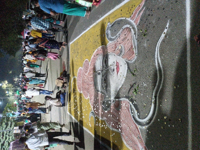 A large crowd gathers along a road with a vibrant, elaborate kolam (Rangoli) artwork depicting a face with a long, flowing design. The artwork is colored white, red, gray, and yellow, and is adorned with what appear to be coins and plant debris. The street is marked with yellow and white lines. People are standing and sitting, some close to the artwork. The scene appears to be lit by streetlights.