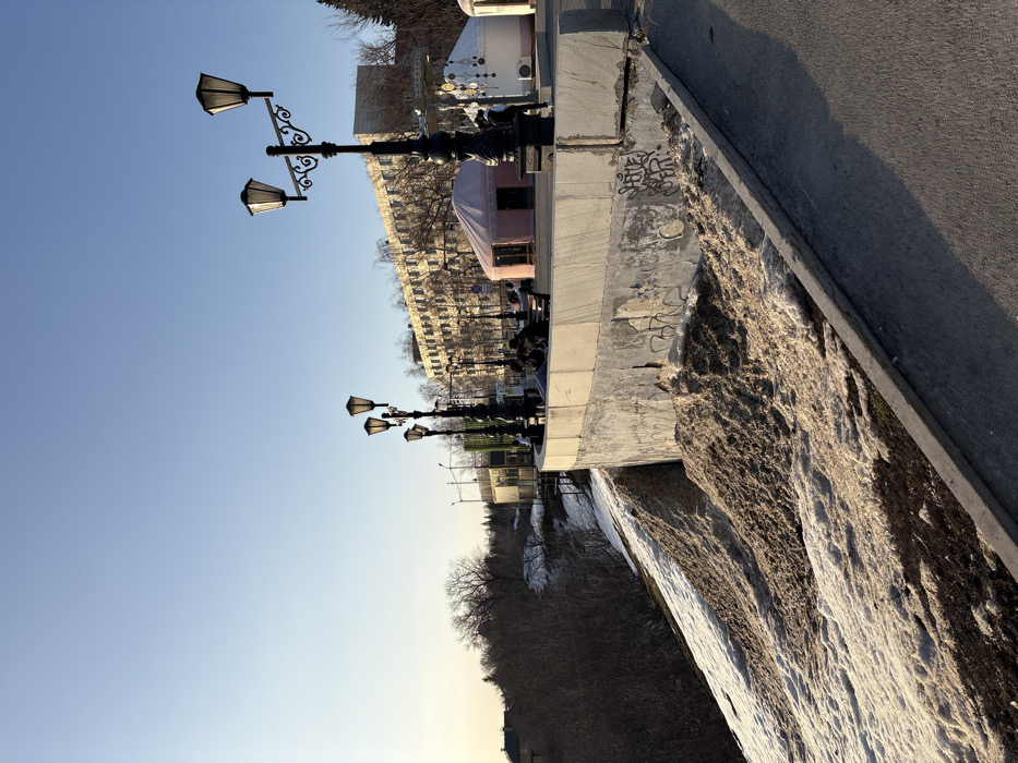 The image displays an elevated urban promenade in Ufa, Russia, likely overlooking a natural slope, possibly near the Belaya River, under a clear, pale blue sky illuminated by late afternoon or early evening sunlight. In the foreground, a dark asphalt path curves along the bottom right, bordered by a concrete curb. Above this, a curved concrete retaining wall, approximately 1.5 meters high, forms the edge of the promenade. The lower section of this wall exhibits wear and is marked with black spray paint graffiti. Below the wall, a steep embankment slopes downward, covered by melting, dirty snow mixed with brown earth and debris, indicative of a late winter or early spring season. Bare deciduous trees are visible on the distant part of the slope. On the promenade, behind the retaining wall, several ornate black lampposts with dual lanterns are regularly spaced. Dark park benches are positioned between some of these lampposts. Multiple individuals are seated on these benches, clustered in groups of two or three; their attire appears casual. Further along the promenade, two large, tent-like structures resembling traditional yurts are present. One, positioned centrally, is pinkish-purple with a dark entrance flap. The other, to its right, is white with intricate circular decorations attached to its exterior. A single individual stands near the white yurt. In the background, beyond the promenade structures, a large, multi-story building with a light-colored facade and numerous windows spans horizontally. Other less distinct buildings and bare trees are visible further in the distance.