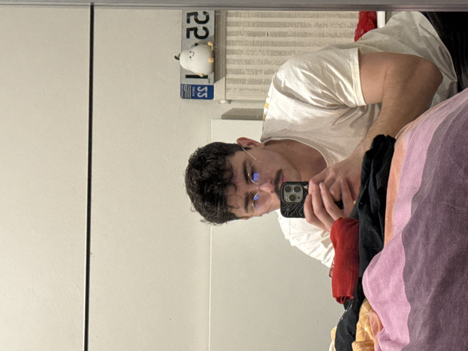 A man with curly dark hair, wearing glasses and a white t-shirt, takes a selfie in a mirror