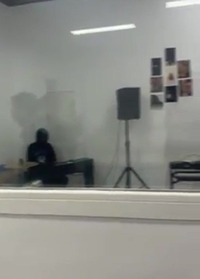 recording studio seen through a window. Inside, there are three people: one playing drums, another playing a keyboard, and a third sitting and playing a tambourine. The studio is white with multiple pieces of music equipment and a sign that says "UMUSIC FAMILY". The camera pans slowly from left to right, showing each person in turn.
