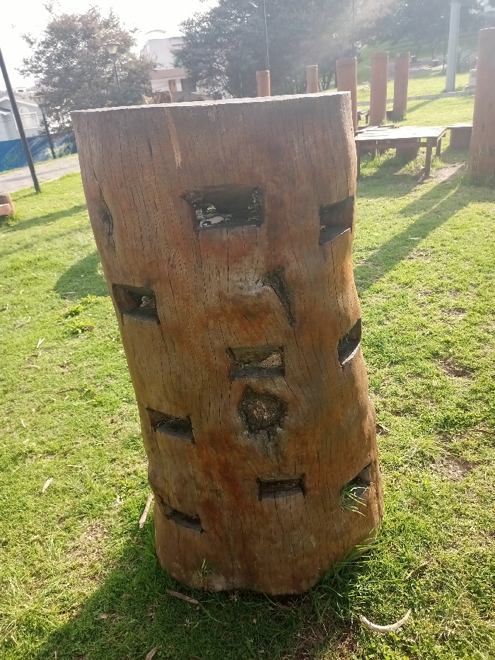 A thick, carved wooden stump stands in a grassy field. Square and rectangular holes punctuate its surface, some filled with dark, possibly resinous material. In the background, more wooden structures rise from the grass, including upright posts and a picnic table. The sunlight casts shadows on the uneven green lawn. A building and trees are visible in the distance.