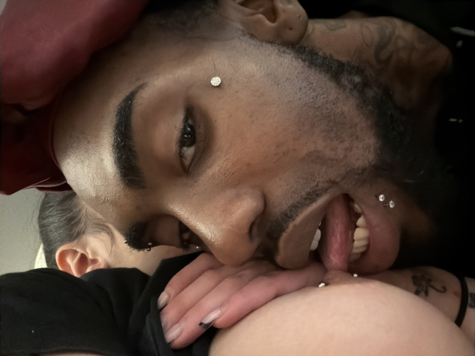 A person with dark skin, facial piercings, and a full beard leans closely towards a lighter-skinned individual. The person's tongue protrudes, appearing to make contact with the other person's chest. The lighter-skinned individual's hand rests between the faces, with a glimpse of a tattoo and a black bracelet visible. The overall composition is intimate and close-up.