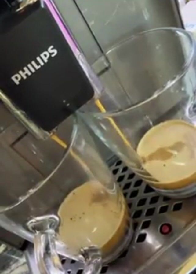 A Philips coffee maker is brewing coffee into two glass mugs