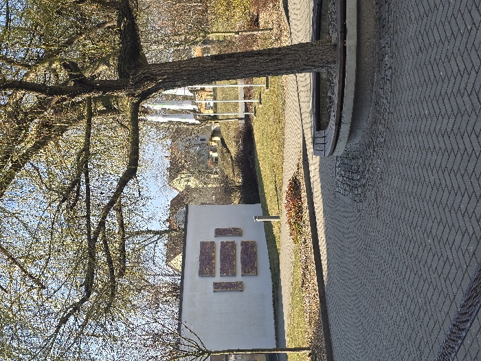This image displays an outdoor public space in Lutherstadt Eisleben, Germany, under clear daylight conditions. No individuals are present. In the immediate foreground, a patterned pathway of grey interlocking pavers, arranged in a herringbone pattern, covers the ground. To the right, a multi-trunked tree with light green budding foliage is centered within a circular concrete planter that features wooden slats, forming a bench around its base. Shadows are cast across the paved surface, indicating direct sunlight. The midground features a low, white-painted concrete wall situated on the left. Mounted on this wall is a decorative arrangement of five rectangular panels. These panels possess a textured surface with reddish-brown and gold tones. The configuration consists of three panels vertically aligned in the center: a top narrow vertical panel, a middle wider horizontal panel, and a bottom narrow vertical panel. Two additional narrow vertical panels flank the middle horizontal panel, positioned to its left and right. Adjacent to the wall, a small cylindrical grey bollard or light fixture stands on a patch of green grass, which also features a small cluster of reddish-brown shrubbery. The paved path is bordered by a raised curb and a strip of grass. In the background, a gentle grassy slope ascends. At the top of this slope, several multi-story residential buildings with distinct reddish-brown tiled roofs are visible amongst numerous deciduous trees, some with minimal foliage. To the right, three tall white flagpoles stand, each flying a white flag or banner, one of which shows a green logo. The sky above is clear and blue with minimal haze.