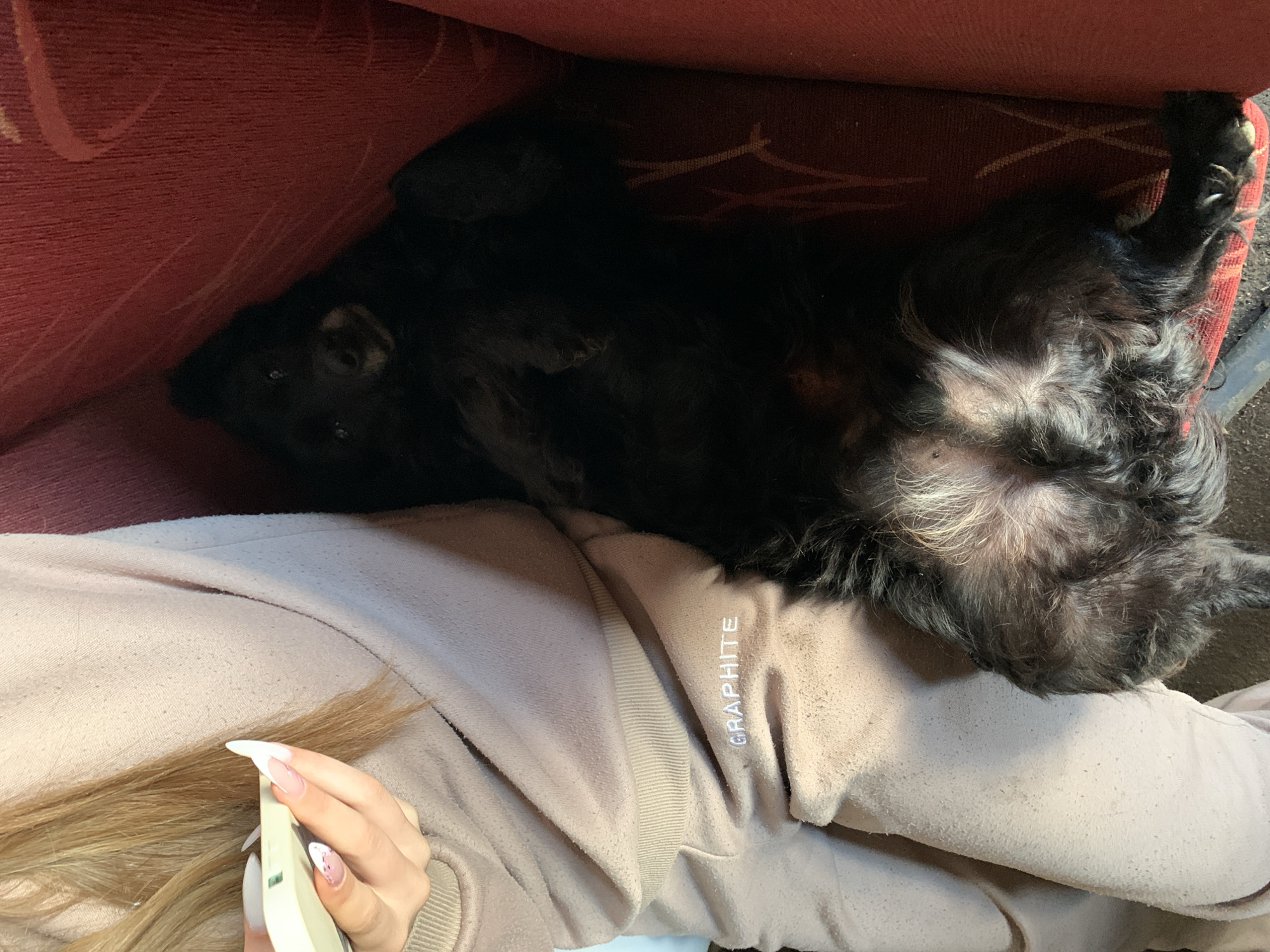 An indoor scene features a person and a dog. The upper left portion of the image displays the lower torso, lap, and right hand of a person with visible long blonde hair. The person is wearing a light beige tracksuit, with the word "GRAPHITE" embroidered in white capital letters on the left thigh. The tracksuit fabric exhibits noticeable pilling. The person's right hand, featuring long, manicured nails with a white French tip style on some fingers and scattered pink glitter on another, grasps a small, off-white electronic device that has a visible green indicator light. To the right, a black-furred dog lies on its back on a red fabric armchair or sofa, exposing its belly which shows a mix of black and lighter greyish-white fur. The dog's head is slightly turned, revealing its dark eyes and snout. The red fabric seating surface features a subtle, lighter-colored linear pattern. No visual information within the image corroborates a specific location in Lehchevo, Bulgaria.