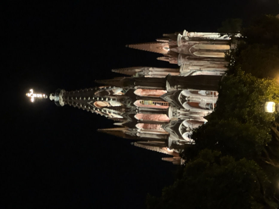 A vertical shot showcases a cathedral at night
