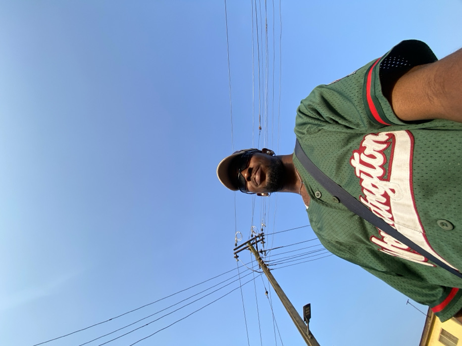 A low-angle shot shows a man in a green baseball jersey with "Washington" across the chest. He wears a tan baseball cap and sunglasses. A black strap crosses his torso. Overhead, power lines crisscross against a bright blue sky. A utility pole stands to his right, with a streetlight attached lower down. A partial view of a building is visible in the lower right corner.
