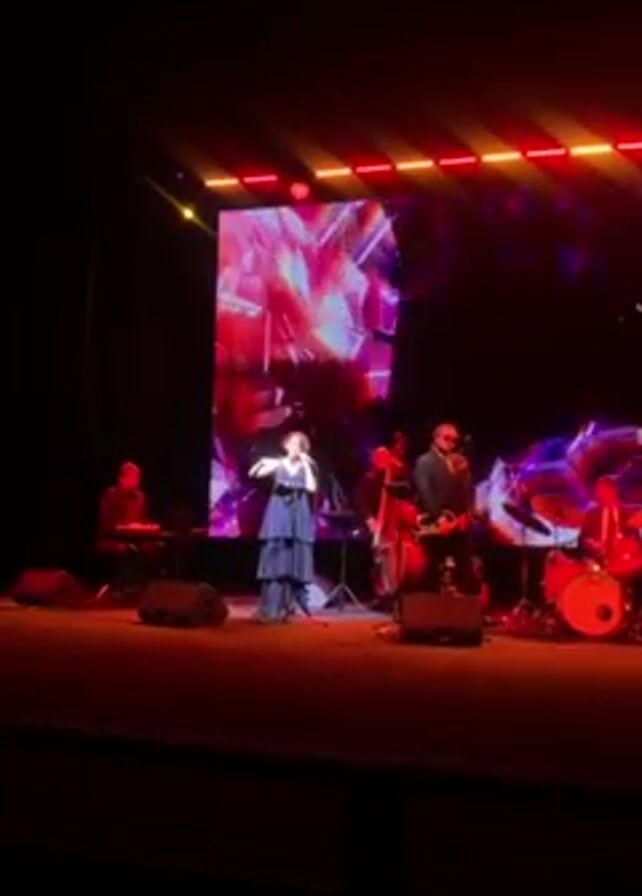 band performing on a stage with a large screen behind them displaying an abstract, colorful pattern. The band consists of a female vocalist in a dark blue dress, a keyboardist on the left, a bassist in the center, a saxophonist in a suit to the right of the bassist, and a drummer on the right. The lighting is predominantly red and orange, creating a warm ambiance on stage. The camera is static and captures the full band from a medium distance.