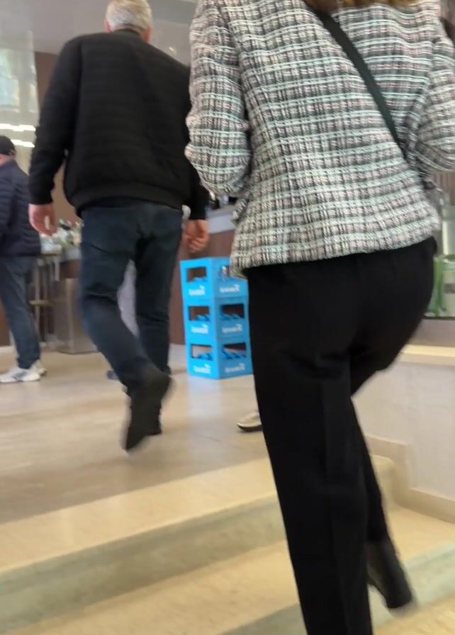 interior of a café or restaurant. Several people are walking up a short flight of stairs. One person in the foreground wears a black quilted jacket and jeans. A woman in a black and white patterned jacket and black pants follows. Other people are at the bar, including staff, who appear to be taking orders. The décor includes a painting with music-themed imagery and candelabras. A section of the counter is decorated with artificial greenery. There are shelves stocked with alcohol behind the counter.