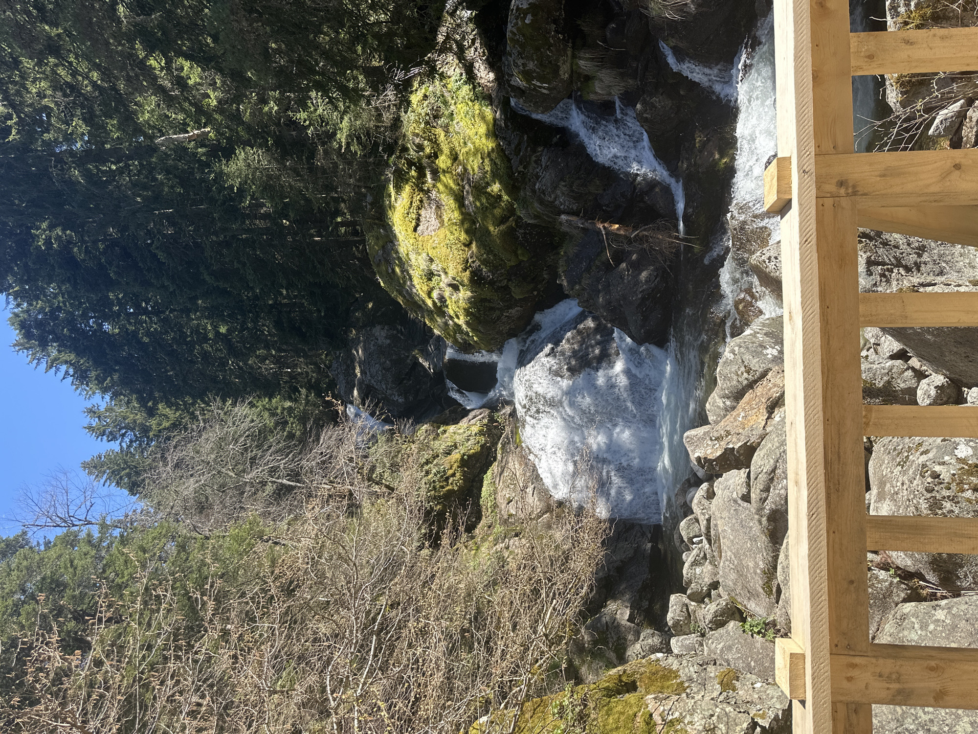 The image depicts a waterfall cascading through a rocky ravine, viewed from a wooden bridge or viewing platform