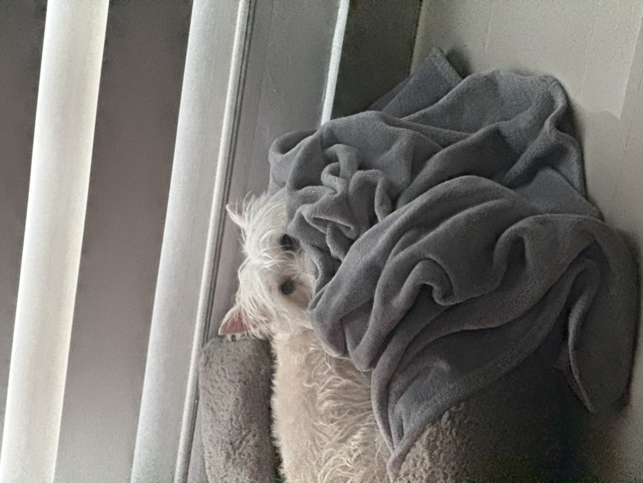 - "A small, white, furry dog is depicted resting on a grey, plush dog bed, partially concealed by a rumpled grey blanket" by FM-avfjN2, licensed under CC BY 4.0