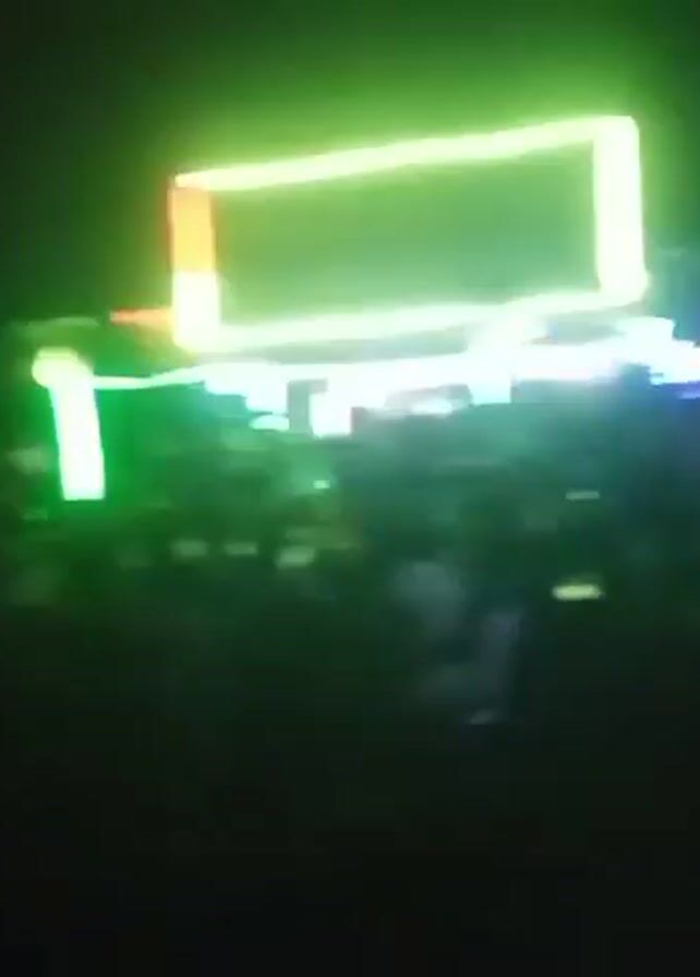 The video depicts a crowd of people at night, gathered in front of what appears to be a small stage or structure illuminated by green and blue neon lights outlining a rectangular shape. The crowd's faces are not clearly visible due to the low light, but their silhouettes suggest they are mostly standing and facing the stage. The environment appears to be outdoor, possibly a public space or venue hosting an event. A sign is visible on the left side of the frame. Loud music is playing in the background.