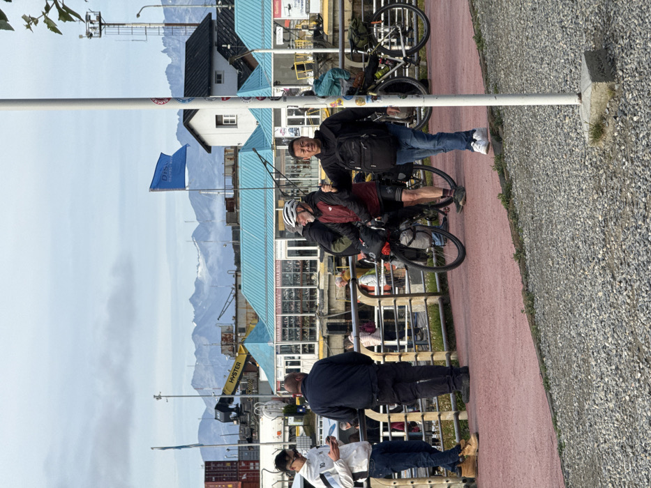 The image depicts an outdoor scene at the Ushuaia, Argentina port. In the foreground, a red-paved pathway spans horizontally, bordered by a gravel area in the immediate front. A white vertical pole, affixed to a square concrete base, stands on the gravel area to the right. Four adult males are positioned on or near the red pathway. From left to right: 1. An East Asian male, wearing a white long-sleeved shirt with the number "10", dark trousers, and tan boots, stands facing right, engrossed with a smartphone held in both hands. 2. A Caucasian male, bald, dressed in a dark jacket and trousers, stands with his back largely towards the viewer, facing the port structures. 3. A bearded Caucasian male, wearing a white cycling helmet, a red and black cycling jacket, black shorts, and sneakers, stands beside a black touring bicycle equipped with front and rear panniers. He holds the bicycle's handlebars with his left hand and faces right, appearing to interact with the next individual. 4. An East Asian male, wearing a dark jacket, blue jeans, white sneakers, and a black backpack, stands facing left, with his right arm raised and hand clenched towards the third male. A second, white-framed touring bicycle equipped with bags is partially visible behind him. In the mid-ground, beyond a metal railing, lies the port area. It features several light blue-roofed buildings, some with large display windows, likely commercial establishments. Behind these structures, a white building with a dark roof is visible. Further in the background, industrial elements include red shipping containers, a yellow "HYSTER" crane, and other machinery. A blue flag displaying partial text "DISC..." is mounted on a pole near the blue-roofed buildings. The distant background reveals snow-capped mountains beneath a cloudy, light-colored sky.