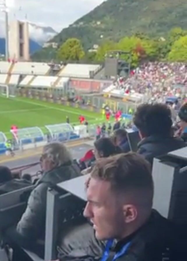 The video captures an inside view of a soccer stadium, seemingly from a VIP or press box