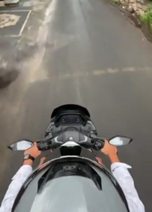A first-person perspective video shows someone riding a motorcycle on a narrow, paved road