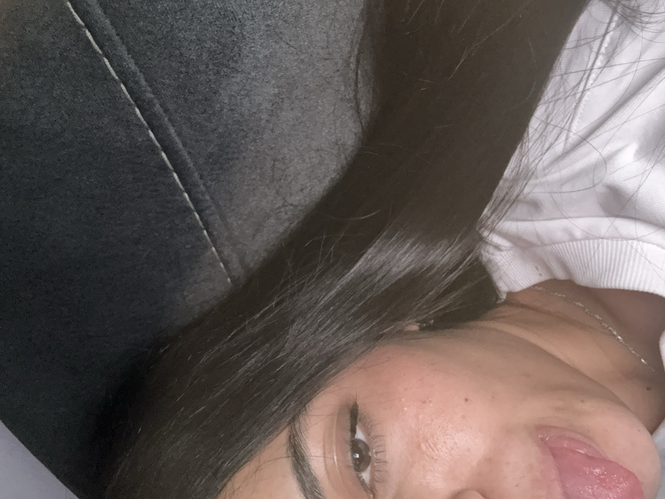 The image displays an oblique close-up portrait of a young female individual. Her left eye is visible, featuring dark eyeliner, and is directed towards the viewer. The dermal surface of her visible left cheek exhibits multiple minor pigmented lesions, consistent with freckles or blemishes. Her oral cavity is open, with her tongue protruding in a playful manner. Long, dark, straight hair cascades from the subject's head, partially obscuring the upper right portion of the frame and resting over her right shoulder. She is attired in a white, ribbed long-sleeved garment, and a thin silver necklace is visible around her neck. The background consists of a dark, textured material, likely upholstery, featuring a prominent diagonal stitched seam extending from the upper-center to the mid-right. The scene is characterized by dim, localized illumination highlighting the subject's face. The location is in the city of Holon, Israel.