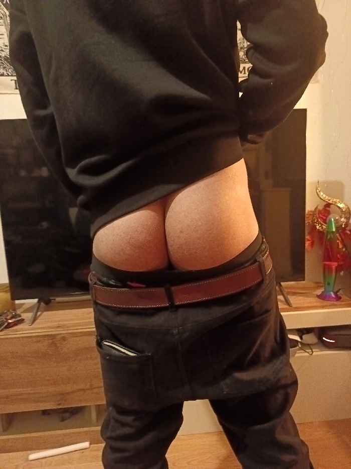 A man with his pants pulled down slightly, exposing his buttocks. He is wearing a black long-sleeved shirt and black jeans held up by a brown leather belt. A wallet is visible in his back pocket. The photo is taken indoors, with a television and a lava lamp in the background. The man's back is turned to the camera.