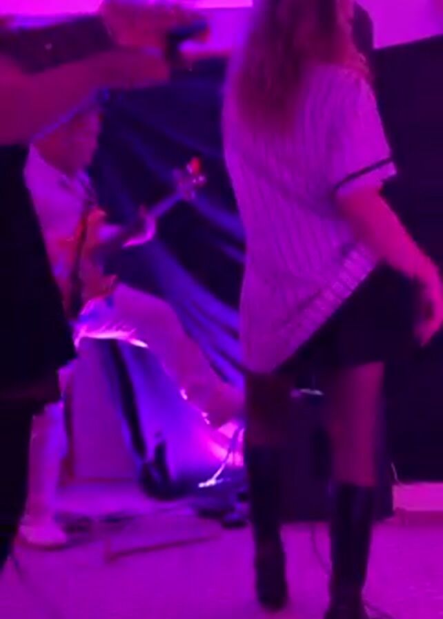 A music band performs on a small stage illuminated by vibrant purple lights. A female vocalist, wearing a baseball jersey, a short skirt, and high black boots, sings into a microphone. To her left, a man wearing a black outfit sings and claps. A bassist in white attire plays behind them. The backdrop features a dark curtain and black speakers. The room appears intimate, and the floor has a textured pattern.