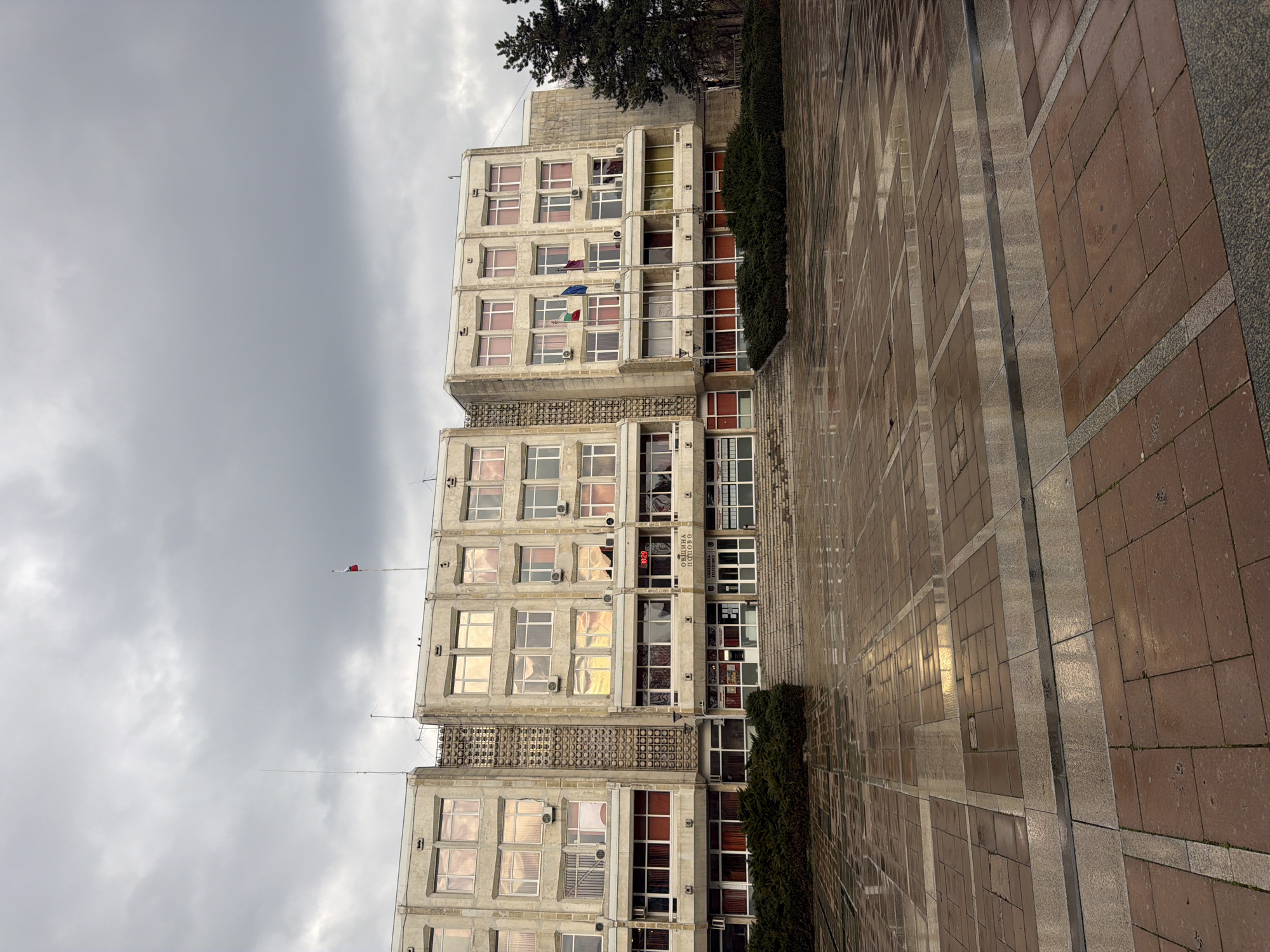 The image depicts the municipal building of Popovo, Bulgaria, under an overcast sky
